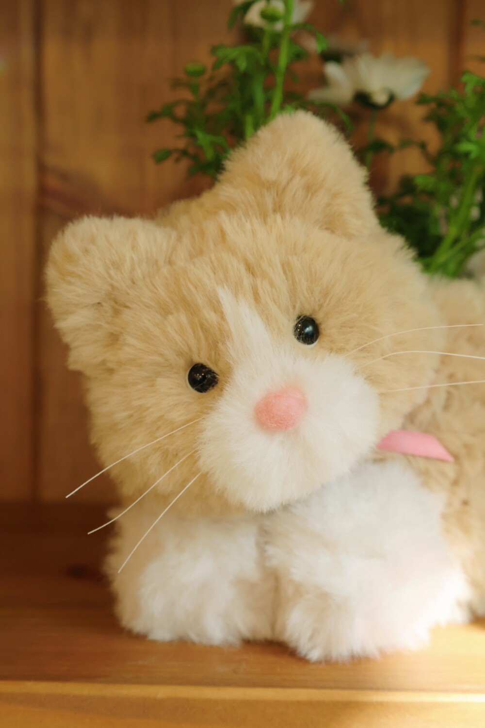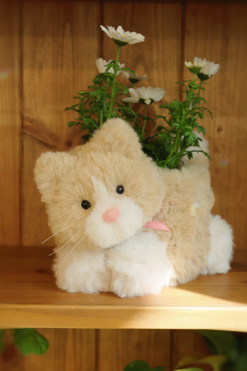 테이블 위 데이지 가득 안은 치즈냥이 한마리